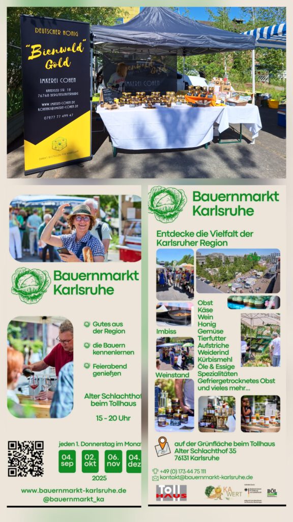 - Karslruher Bauernmarkt auf dem Gelände des Alten Schlachthofs in Karlsruhe war ein voller Erfolg. Im Zuge es Tags der offenen Tür „ausgeschlachtet“ durften wir neben vielen anderen regionalen Produzenten unseren Honig anbieten. Dabei waren allerlei Köstlichkeiten, von Öl und Mehle aus dem Kraichgau, alles rund um das Schaf und deren Wolle aus Kandel in der Pfalz, eine Biokisten Lieferant aus Bühl und viele mehr.